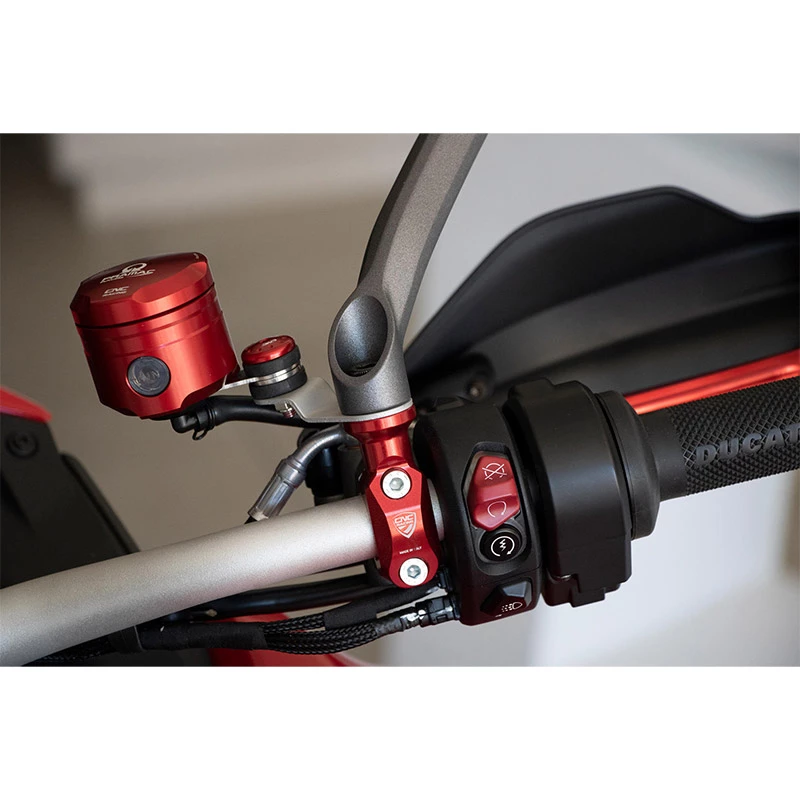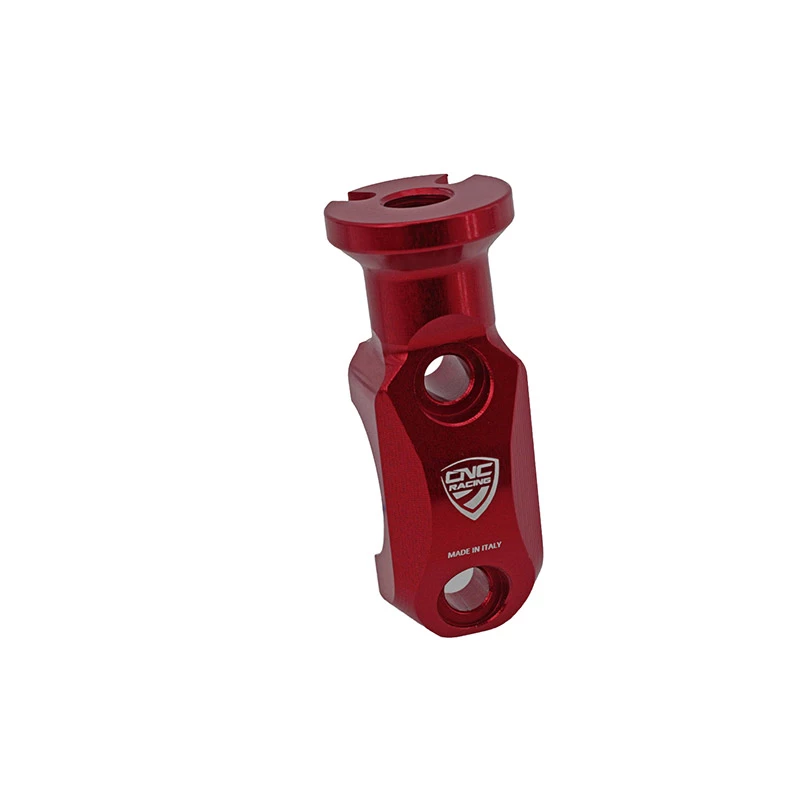 Cavallotto per il comando freno anteriore con foro M10 filettatura sinistrorsa per il montaggio dello specchio realizzato dal pieno in lega leggera tramite macchine CNC e successiva anodizzazione superficiale.