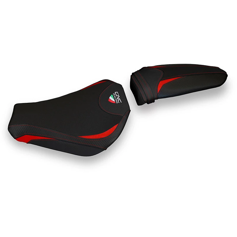 Rivestimento sella realizzato in ecopelle CorduraLook antiscivolo nero ed inserti laterali in ecopelle CarbonLook nero e rosso con cuciture in contrasto rinforzate a doppio punto. Impermeabile e resistente ai raggi solari. Alta resistenza agli agenti chimici