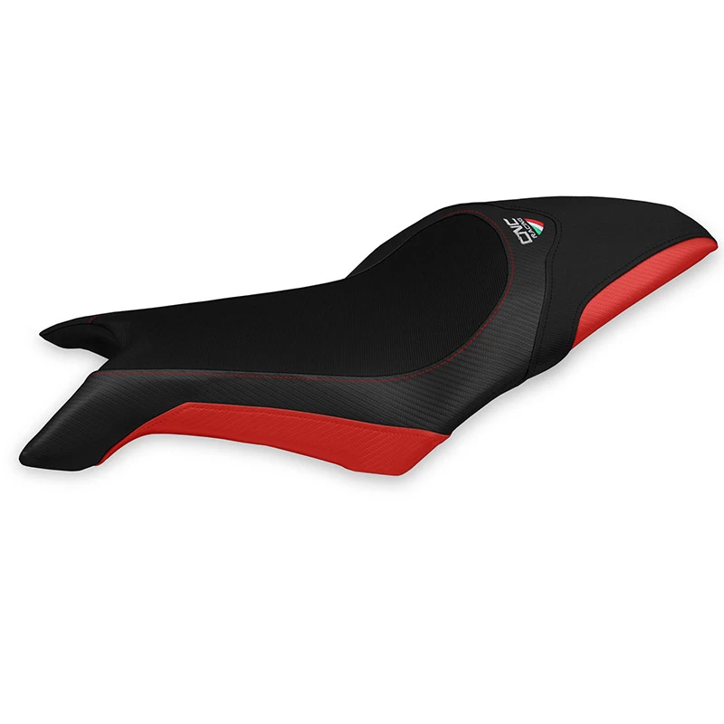 Rivestimento sella realizzato in ecopelle CorduraLook antiscivolo nero ed inserti laterali in ecopelle CarbonLook nero e rosso con cuciture in contrasto rinforzate a doppio punto. Impermeabile e resistente ai raggi solari. Alta resistenza agli agenti chimici