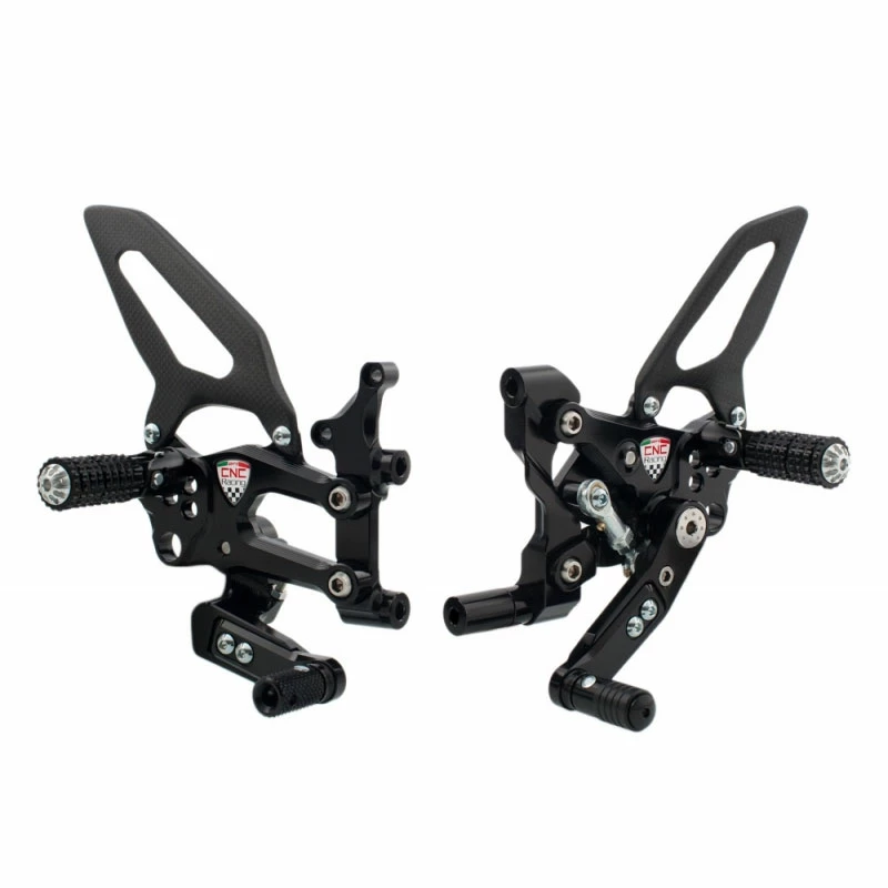 Materie prime di qualità, leggerezza della lega AL 7075 T6 , robustezza e sicurezza della viteria alleggerita in acciao, componenti di montaggio specifici per un utilizzo estremo. Accessori in carbonio che donano al kit le caratteristiche di leggerezza e di estetica ricercata. Poggiapiede “racing” godronato per il massimo grip anche nelle condizioni più critiche di bagnato. Reclinabile e bloccabile mediante spina elastica in acciaio Cinque posizionamenti per il poggiapiede, offrendo ampia scelta di setting di arretramento laterale ed in altezza rispetto la configurazione stock. Foro per cavalletto moto da officina. Configurazione cambio rovesciato e cambio normale, leva cambio infulcrata su doppio cuscinetto a sfera e puntale leva cambio girevole in teflon e reclinabile, eventualmente bloccabile. Regolazioni “cursore leva cambio” su guida di scorrimento (range di 35 mm. rispetto la configurazione stock – -20 +15 mm). Viteria lavorata alleggerita in acciaio Aisi 304. Anodizzazione estetica nero brillante, attacco per sensore luce stop. Finitura tridimensionale e accuratezza in ogni dettaglio rendono il prodotto unico e inconfondibile. Leva freno infulcrata su doppio cuscinetto a sfera, puntale leva freno godronato per il massimo grip e reclinabile. Regolazioni “cursore leva freno” su guida di scorrimento (range di 35 mm. rispetto la configurazione stock – -20 +15 mm). Viteria lavorata alleggerita in acciaio Aisi 304. Paratacchi interamente costruito in carbonio, studiato per garantire l’ottimale appoggio e protezione. Compatibilità: Ducati 899 Panigale Ducati 959 Panigale Ducati 1199 Panigale Ducati 1199 Panigale S Ducati 1199 Panigale S Tricolore Ducati 1199 Panigale R Ducati 1199 Superleggera Ducati 1299 Panigale Ducati 1299 Panigale S
