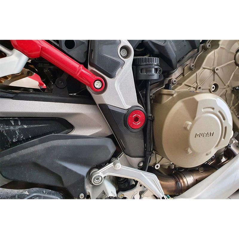 Kit viti centrali per le pedane originali della Ducati Multistrada V4, realizzate dal pieno in lega leggera con successivo trattamento di anodizzazione superficiale. Sostituiscono le originali senza alcuna modifica.