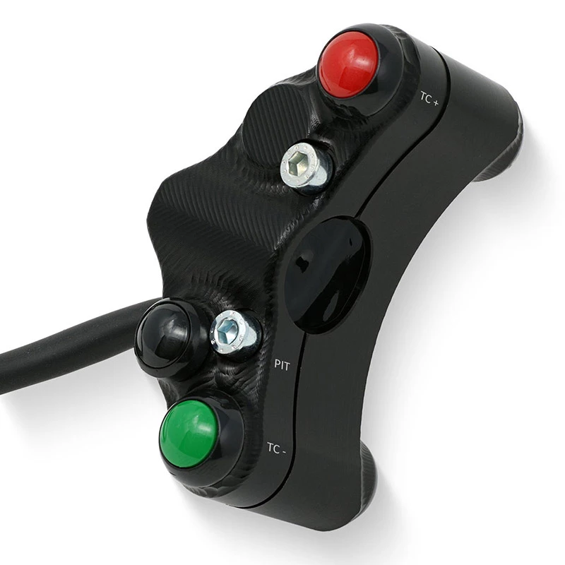 Il corpo pulsantiera è ricavato dal pieno in alluminio 7075 (Ergal) e successivamente sottoposto a processo di anodizzazione dura nera, che ne esalta le lavorazioni con i macchinari a controllo numerico. I pulsanti/interruttori utilizzati sono a norma militare IP67, norma che certifica la tenuta stagna della pulsantiera stessa. Il funzionamento di ogni pulsante è assicurato per oltre 700.000 cicli. Il montaggio plug&play è semplicissimo: basta smontare la pulsantiera originale e sostituirla con la pulsantiera CNC Racing, collegando lo spinotto al cavo originale della moto. Non occorre intervenire in alcun altro modo sulla moto ed è sempre possibile tornare alla configurazione originale senza alcun tipo di modifica.