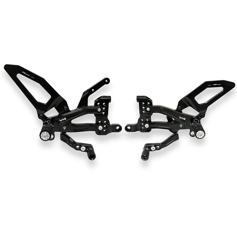 Materie prime di qualità, robustezza e componenti di montaggio specifici per un utilizzo estremo caratterizzano le nuove pedane per Ducati Streetfighter V4/V4 S. Caratteristiche principali: 1) sezioni maggiorate per i punti di massima sollecitazione. 2) 12 posizioni di regolazione. 3) configurazione per cambio stradale e cambio rovesciato senza alcuna modifica. 4) poggiapiede “racing” godronato per il massimo grip anche nelle condizioni più critiche di bagnato. 5) foro per cavalletto moto da officina. 6) paratacchi interamente costruito in alluminio, studiato per garantire l’ottimale appoggio e protezione. 7) poggiapiedi e puntalini leve sono reclinabili e bloccabili mediante spine elastiche in acciaio, incluse nel kit. 8) le leve cambio e freno posteriore sono montate su cuscinetti per una ottimale scorrevolezza. 9) idrostop incluso.
