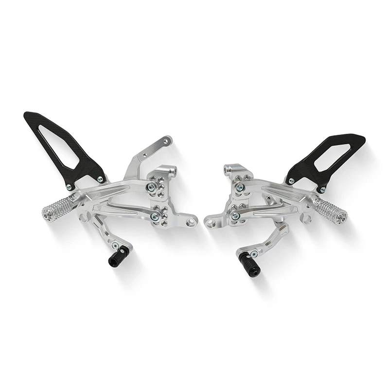 Materie prime di qualità, robustezza e componenti di montaggio specifici per un utilizzo estremo caratterizzano le nuove pedane per Ducati Streetfighter V4/V4 S. Caratteristiche principali: 1) sezioni maggiorate per i punti di massima sollecitazione. 2) 12 posizioni di regolazione. 3) configurazione per cambio stradale e cambio rovesciato senza alcuna modifica. 4) poggiapiede “racing” godronato per il massimo grip anche nelle condizioni più critiche di bagnato. 5) foro per cavalletto moto da officina. 6) paratacchi interamente costruito in fibra di carbonio, studiato per garantire l’ottimale appoggio e protezione. 7) poggiapiedi e puntalini leve sono reclinabili e bloccabili mediante spine elastiche in acciaio, incluse nel kit. 8) le leve cambio e freno posteriore sono montate su cuscinetti per una ottimale scorrevolezza. 9) idrostop incluso.