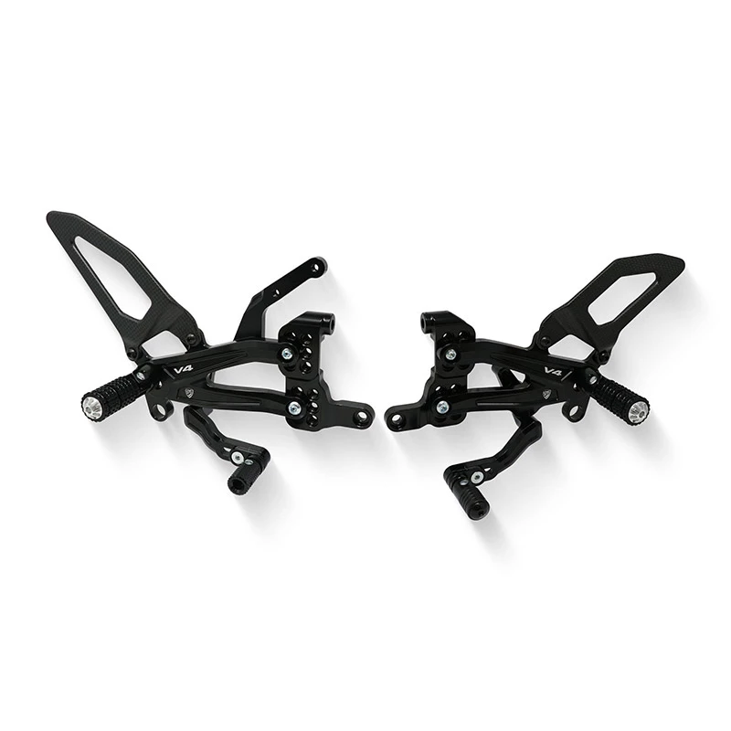 Materie prime di qualità, robustezza e componenti di montaggio specifici per un utilizzo estremo caratterizzano le nuove pedane per Ducati Streetfighter V4/V4 S. Caratteristiche principali: 1) sezioni maggiorate per i punti di massima sollecitazione. 2) 12 posizioni di regolazione. 3) configurazione per cambio stradale e cambio rovesciato senza alcuna modifica. 4) poggiapiede “racing” godronato per il massimo grip anche nelle condizioni più critiche di bagnato. 5) foro per cavalletto moto da officina. 6) paratacchi interamente costruito in fibra di carbonio, studiato per garantire l’ottimale appoggio e protezione. 7) poggiapiedi e puntalini leve sono reclinabili e bloccabili mediante spine elastiche in acciaio, incluse nel kit. 8) le leve cambio e freno posteriore sono montate su cuscinetti per una ottimale scorrevolezza. 9) idrostop incluso.