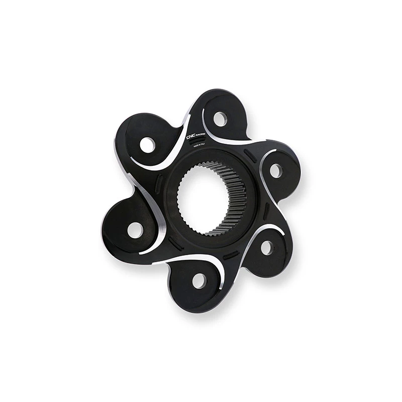 Flangia portacorona per Ducati con perno ruota posteriore a 6 fori lavorata dal pieno in lega leggera con successiva anodizzazione superficiale.